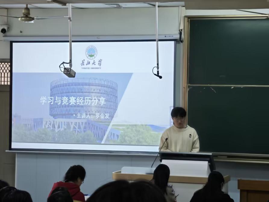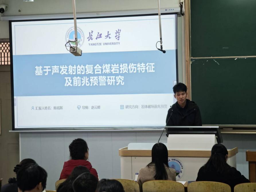 在技术应用与学科交叉环节,电子信息与电气工程学院的尹恒同学与城市建设学院的陈铭辉同学先后展示了各自的研究成果,尹恒同学深入剖析了边缘计算在油井动液面测量中的应用,并分享了其成果在国际会议SPWLA上的报告经历,展示了传统能源领域的智能化转型前景;陈铭辉同学则结合详实数据,讲解了声发射技术在复合煤岩损伤特征及前兆预警中的应用进展。两位的汇报不仅逻辑严密,更生动体现了跨学科技术在解决实际工程难题中的重要价值,引发了现场师生的热烈探讨。