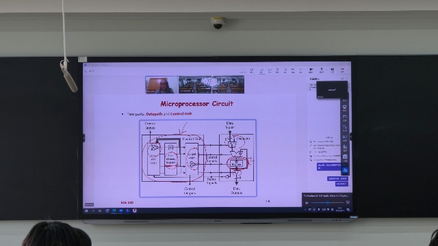作为该专业首个美方授课学期,本次课程采用了全英文讲授专业核心知识。屏幕上,Professor Hou以组合逻辑电路和时序逻辑电路的定义切入,结合ALU、寄存器等实际应用场景,逐步引出微处理器中数据通路与控制单元的分工逻辑。虽然同学们首次面对全英文专业课讲授略显紧张,但大家都兴致满满,跟随板书节奏认真记录笔记。“老师讲解很清晰,但全英文的技术术语连在一起,反应速度还是跟不上。”课后,一位同学坦言。这也是课堂上多数同学的共同感受——美方教师授课逻辑严谨、互动自然,但对习惯于中文教材的学生而言,听力与专业知识的同步理解仍需时间适应。