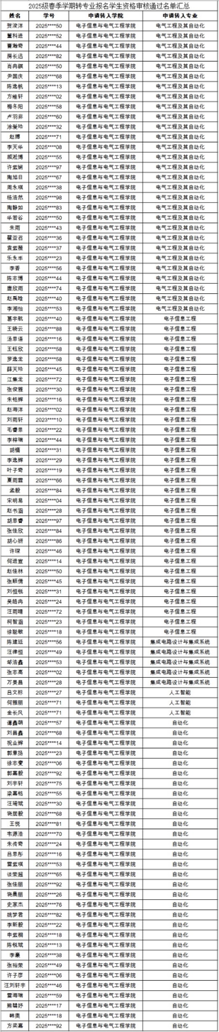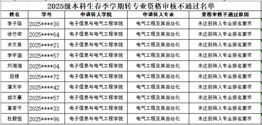 根据《长江大学普通本科生专业分流与转专业管理办法(试行)》(长大校发〔2019〕260号)精神和《关于开展2025级普通本科生春季学期转专业工作的通知》相关要求,经学生本人申请,电子信息与电气工程学院、本科生院资格审核,现将电子信息与电气工程学院2025级本科生春季学期转专业资格审核情况予以公示(见附表)。