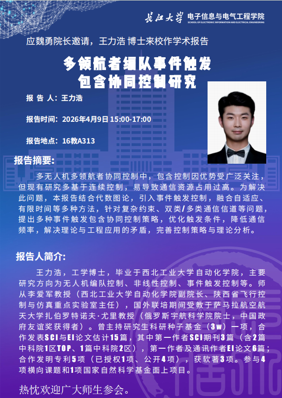 电子信息与电气工程学院2026年学术报告(二):多领航者编队事件触发包含协同控制研究